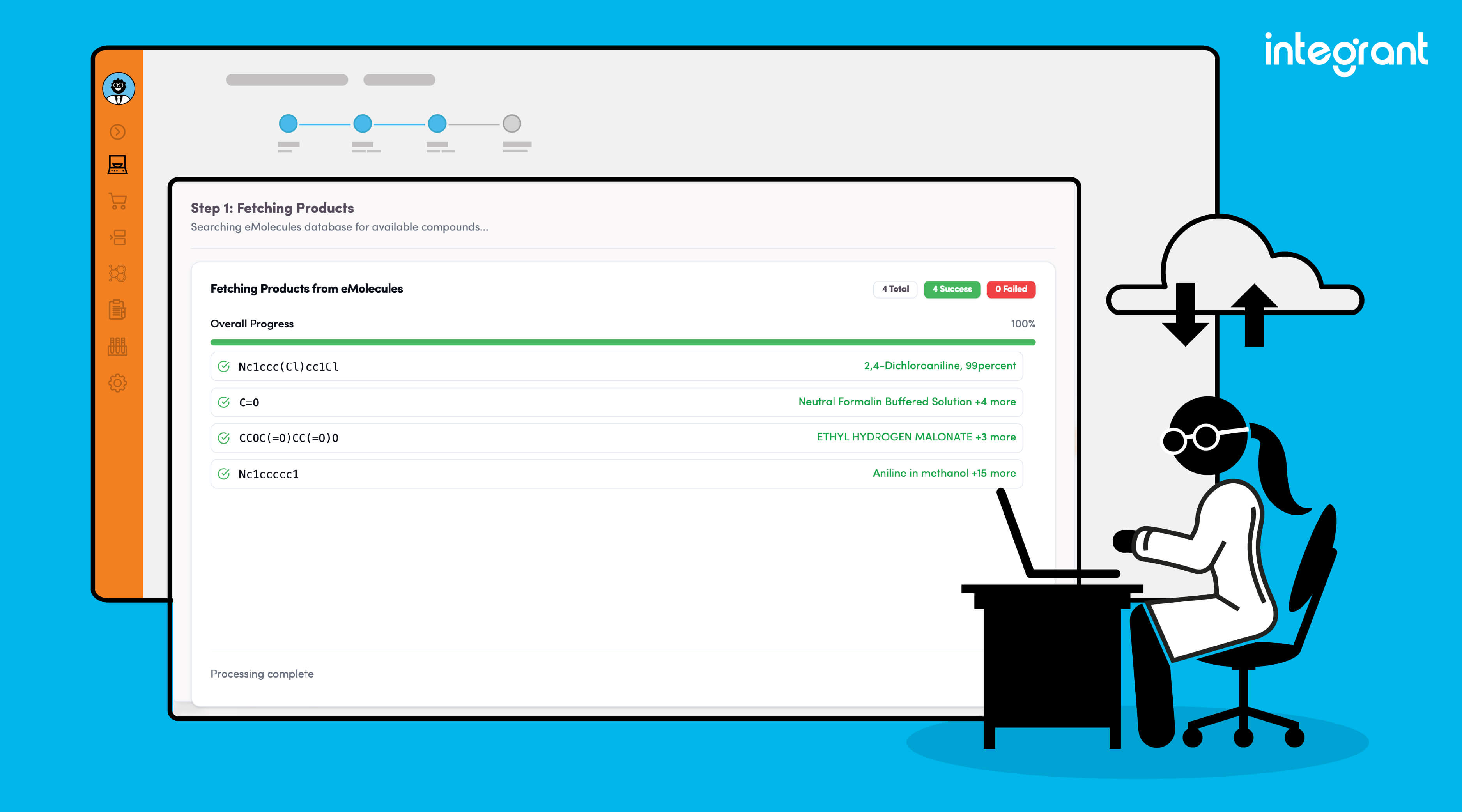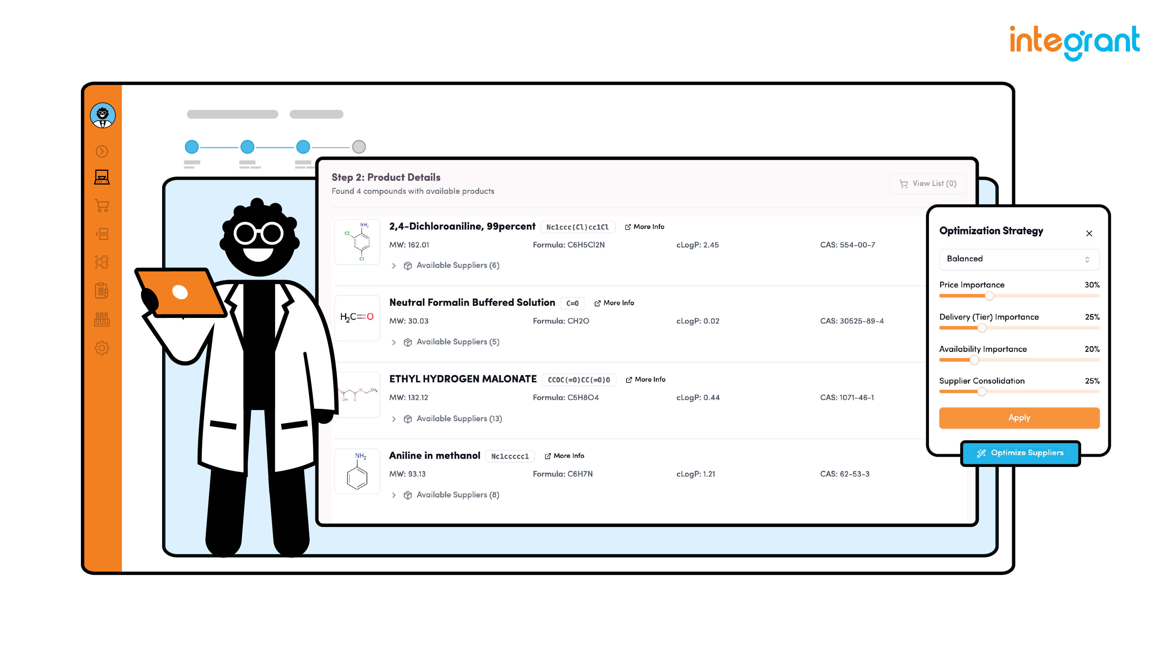 Integrant has strategically collaborated with eMolecules, integrating real-time chemical sourcing data into Integrant’s laboratory automation software. This partnership enables seamless access to essential chemical building blocks within the Integrant workflow, whether sourced from clients' proprietary libraries or directly from eMolecules' extensive library.
